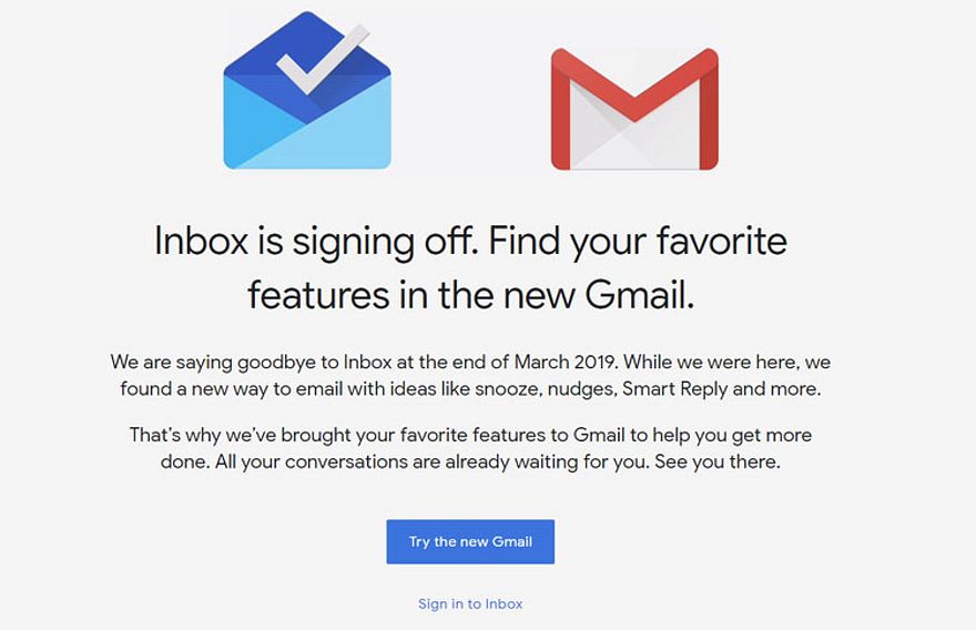 ގޫގުލްގެ ސާވާތަކުގައި "އިންބޮކްސް" އަށް ޚާއްސަ ސަފުހާ، google.com/inbox އަށް ވަނުމުން މިހާރު ދައްކައިދެނީ، "އިންބޮކްސް" ހުއްޓާލަން އުޅޭ ކަމަށް ބުނާ މެސެޖެކެވެ. އޭގެ ބަދަލުގައި ޖީމެއިލް ބޭނުންކުރަން ބުނި ނަމަވެސް، "އިންބޮކްސް" ގައި ހުރި ގިނަ ފަސޭހަތައް އަދި ވެސް ޖީމެއިލް އަކު ނެތެވެ.
