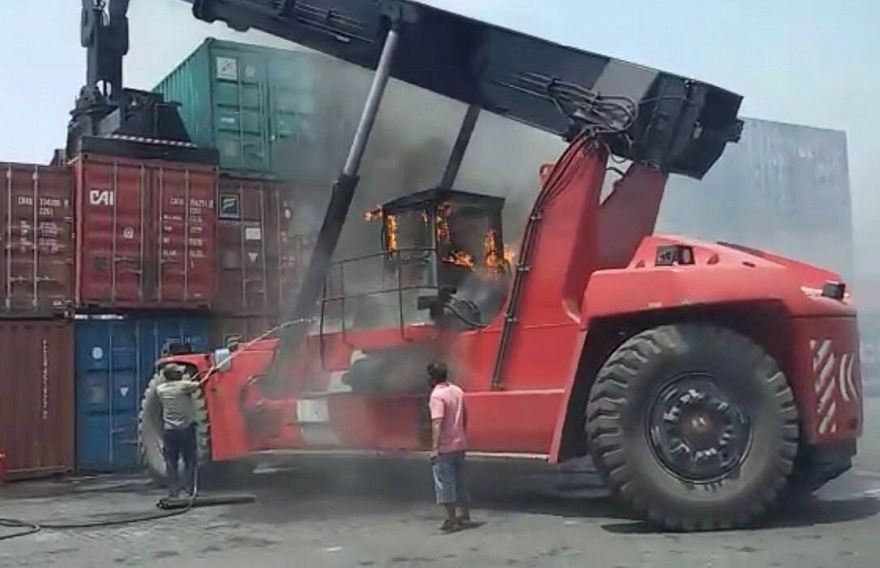 ހުޅުމާލޭގެ ބަނދަރުގައި މޯލްޑިވްސް ޕޯޓްސް ލިމިޓެޑް (އެމްޕީއެލް)އިން ކޮންޓެއިނަރު އުފުލަން ބޭނުންކުރާ ވެހިކަލެއްގައި މިއަދު މެންދުރު ރޯވެ އަނދައިފި އެވެ.