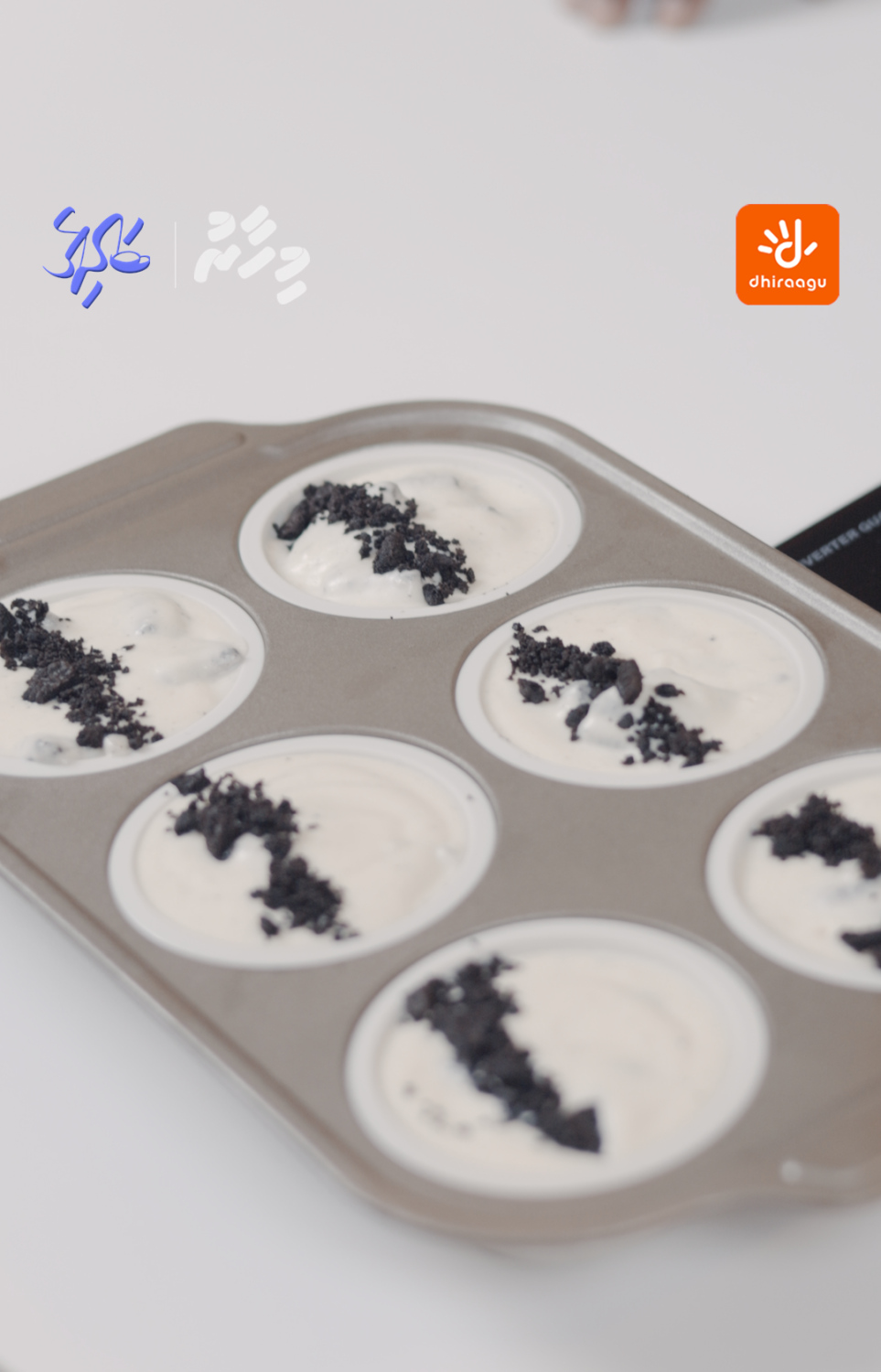ވަކިން ތައްޓެއްގައި ބިސްކޯދުން ވަކިކުރި ކްރީމްކޮޅާއި ވިޕިން ކްރީމާއި ގެރިކިރާއި ވެނީލާ އެސެންސް ރަނގަޅަށް އެއްކޮށްލާށެވެ. ދެން ބިސްކޯދުތައް މަޑުމަޑުން އޭގެތެރެއަށް އެއްކޮށްލާނީ އެވެ. މިބައި އަޅާނީ ކުރިން ތައްޔާރުކުރި ކަޕްކޭކު ތަށިތަކުގެ ތެރެއަށެވެ.