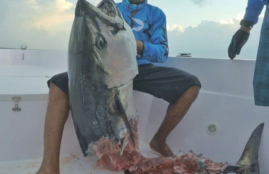 ސަތޭކަ ކިލޯގެ މަހެއް ބޭނުމަކީ ފަސޭހަ ކަމެއް ނޫނެވެ. އައްޑޫ ގަމާ ކައިރީގައި އޮންނަ ކަނޑުއޮޅިއެއް ކައިރިން، ބުޅީގައި މަސް އަޅައިގަތުމާ އެކު، އެ ބިޔަ މަސް ލޯންޗަށް ނަގަން ބައިގަޑިއިރު ހޭދަވި އެވެ. އެކަމަކު ދޮއްޓަކުން މަސް ނަގައި ލޯންޗަށް އެރުވިއިރު، މަހުގެ ބޮޑު ބައި އޮތީ ކާލައިފަ އެވެ. ގާތްގަނޑަކަށް 50 ކިލޯ މަދެވެ.