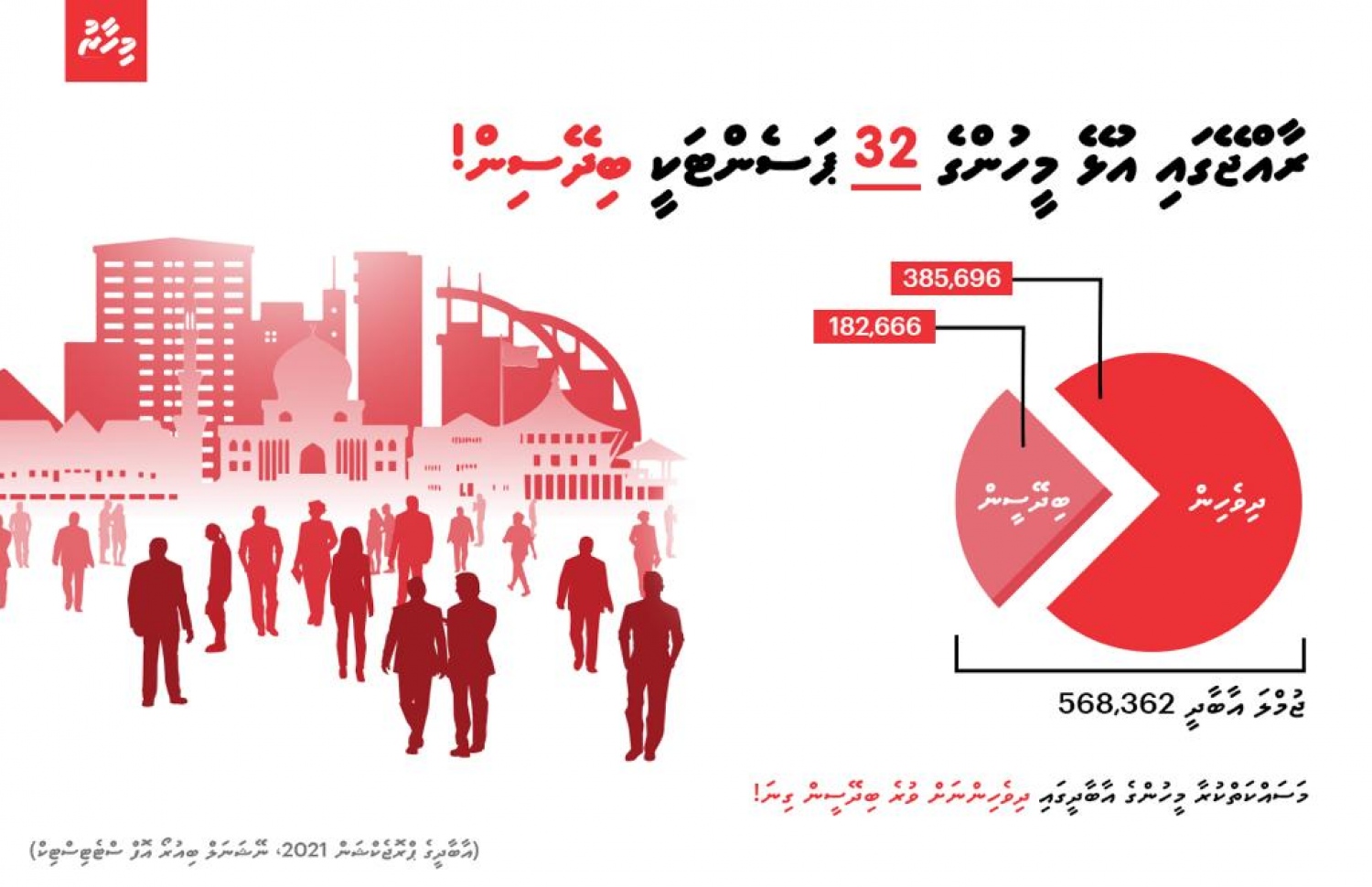 ދުނިޔޭގެ އާބާދީގެ ދުވަހާ ދިމާކޮށް އިއްޔެ އެ ބިއުރޯ އިން އާންމުކުރި އެންމެފަހުގެ ޕްރޮޖެކްޝަންތަކުން ދައްކާ ގޮތުގައި މިހާރު ރާއްޖޭގެ މުޅި ޖުމްލަ އާބާދީ އަކީ 568،362 ކަމަށް ލަފާކުރެވެ އެވެ. އޭގެ ތެރެއިން ބިދޭސީންގެ އަދަދަކީ 182،666 އެވެ.