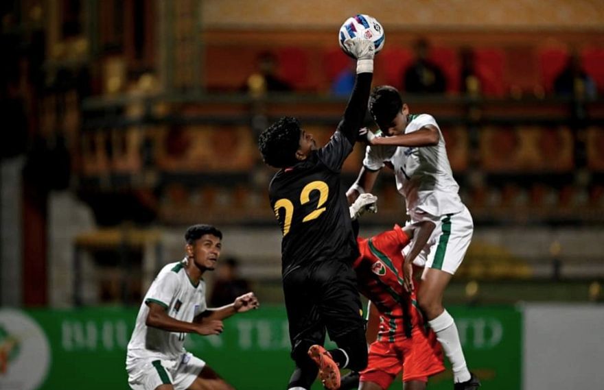 ރާއްޖޭގެ ގޯލްކީޕަރު ހަސަން މާހިލް ނާސިރުގެ ގިނަ ސޭވްތަކެއް ފުރަތަމަ ހާފުގައި ފެނުނު އިރު، ބަންގްލަދޭޝް އިން ގޯލު ޖެހީ ދެވަނަ ހާފު ފެށިގެން ހަތަރުވަނަ މިނިޓުގައި އޭރިއާ ބޭރުން ފޮނުވާލި ބޯޅައަކުންނެވެ.