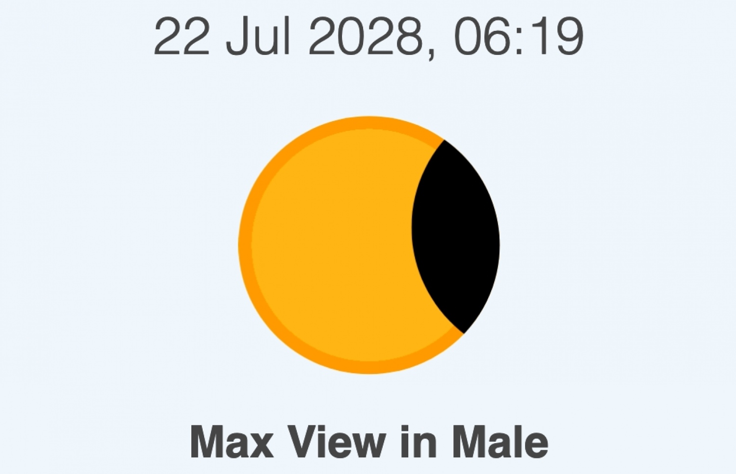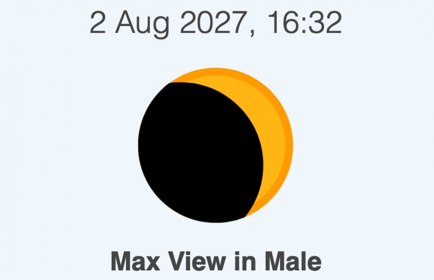 ރާއްޖެއަށް އެންމެ އަވަހަށް ވެސް އިރުކޭތައެއް ފެންނާނީ އޯގަސްޓް 2، 2027 ގަ އެވެ. އެކަމަކު އެއީ ފުރިހަމަ ކޭތައެއް ނޫނެވެ. މާލެއަށް އެ ކޭތަ ހިފަން ފަށާނީ މެންދުރު ފަހު 3:29 ގަ އެވެ. މި ކޭތަ ދެ ގަޑިއިރަށް ދިގު ދެމިގެންދާނެ އެވެ. މި ފަޅި ކޭތަ ވީއްލާނީ ހަވީރު 5:29 ގަ އެވެ. މި ކޭތަ އެންމެ ބޮޑަށް ހިފާފައި ހުންނާނީ 4:32 ގަ އެވެ.