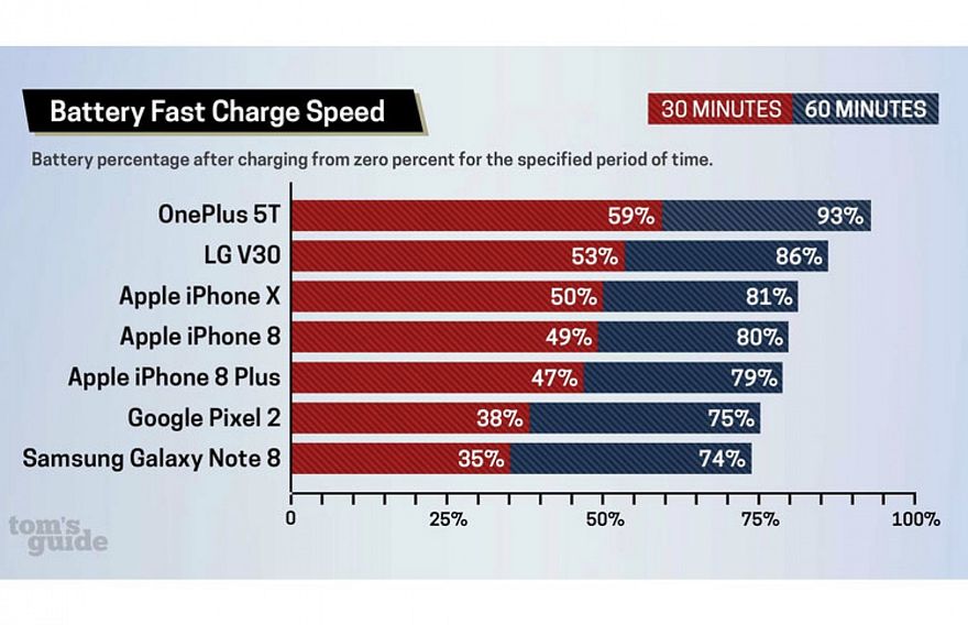 އެންޑްރޮއިޑް ބައެއް ފޯނުތަކުގައި ފާސްޓް ޗާޖިން ޓެކްނޮލޮޖީ މާ ފުރިހަމަ ކަމަށް "ޓޮމްސް ގައިޑް" އިން ކުރި ދިރާސާއަކުން ދައްކައިފި އެވެ. އައިފޯން 10 އަށް ވުރެ "ވަންޕްލަސް 5ޓީ" އަދި "އެލްޖީ ވީ30" ވެސް، ފާސްޓް ޗާޖް މޯޑްގައި، މާ އަވަހަށް ބެޓެރީ ޗާޖްކުރެ އެވެ.